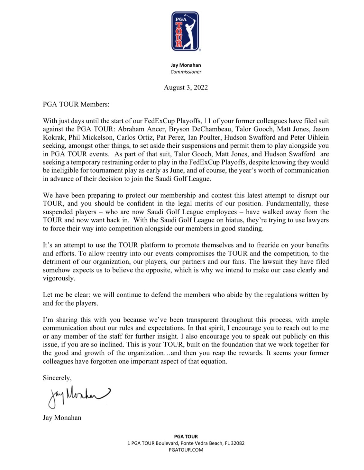 . Web Letter from Jay Monahan to PGA Tour members. Lawyers will pick that apart and he will have to say. Include your name address and daytime phone number.